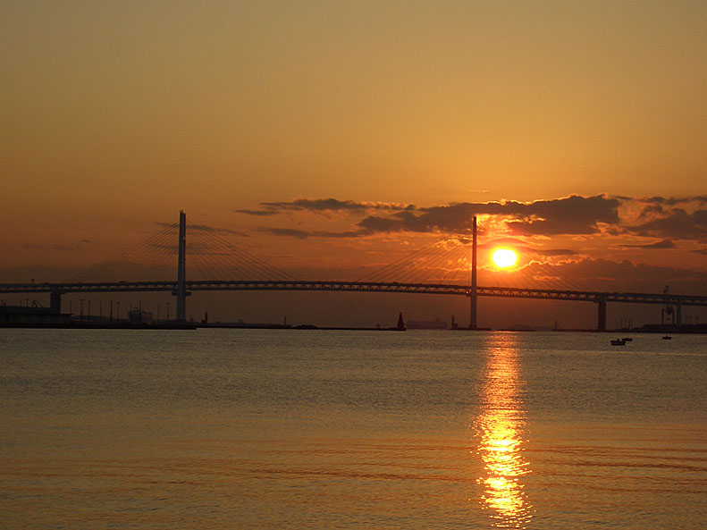 太陽が徐々にのぼり雲の切れ目から頭をのぞかせた。陽光が海面に細長く反射し神々しい初日の出をベイブリッジごしにのぞむことができた。