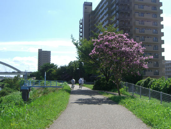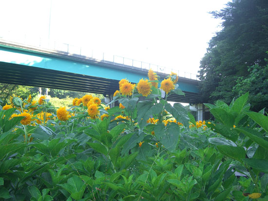 今回も先週に引き続きトレーニング的?に境川遊水池公園まで走行してみた。午前6時過ぎに荷物は最小限にして空身でサドルバッグにあんパンをしのばせて出発。新横浜にでて今回は小机大橋から鶴見川左岸沿いを走行していくことにする。第三京浜高架下あたりは野良猫が多い…。鴨居近辺ではサイクリングコース脇にちらほらと向日葵が咲いていた。夏真っ盛りである。