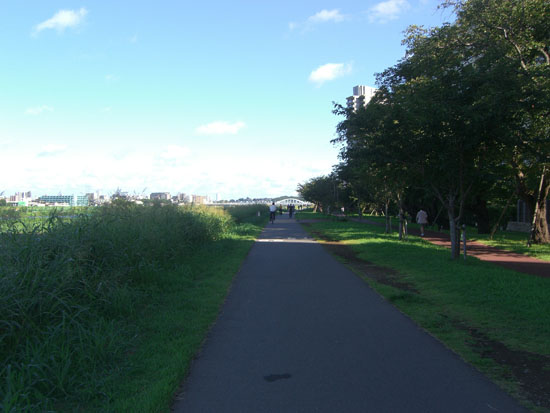 跨線橋を渡ってJR南武線平間駅前を通過しガス橋にでる。歩道は結構混雑していたので車道を走行して橋を渡る。ガス橋脇のトイレ前で小休憩。この辺りは木陰が続いていて夏場は助かる。