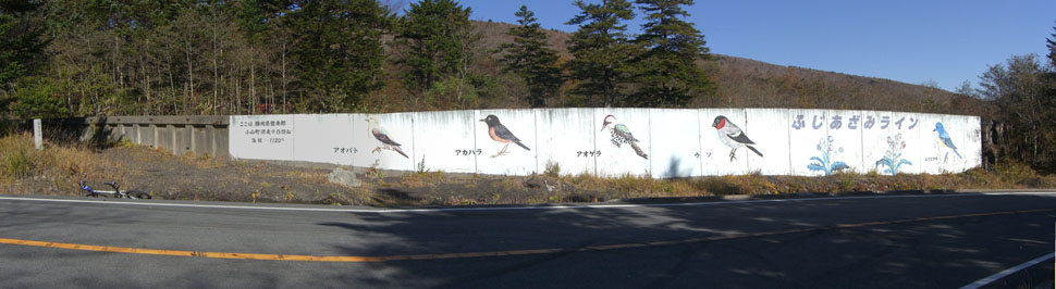さてそれでは行くことにしよう(0840)。国道を横断して短いトンネルを抜けると“ふじあざみライン、新五合目まで11.5km”という看板がある。序盤は鼻歌交じりで富士山を正面を見つつ鳥のさえずりを聴きながら最高に気持ち良くのぼっていく。道路脇に芭蕉句碑などという石碑がある。さらに進むと大日堂入口という分岐路がある。自衛隊の演習場との立体交差を過ぎたあたりから正面に見えていた富士山も次第に左に寄って隠れてきた。斜度もきつくなってきたので蛇行しながらなんとかのぼっていく。白い鳥の看板までのぼり5分ほど小休憩(0915)。道路脇に旧登山道という標柱がたっている。