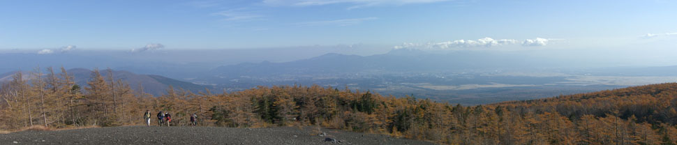 ひとのぼりしてちょっと開けた富士山への見晴らしの良い場所にでた(0950)。ここで自動車でやってきたひとにどこからきたのかとかどこまでいくのかなどと訊ねられる。ここまでですでに1時間を越えてしまっている…。この先からが本番のようだが…。富士山は依然として雲ひとつない青空を背景に聳えている。5分ほど小休憩して先へとすすむことにする。前方に見えていた急坂をのぼるとほどなく馬返しに到着(1000)。ここでやっと半分らしい。さっきの急坂の途中で脚がつりそうになったのでこの先は無理せずのんびりハイキング気分で押していくことにした。歩きながらメーターで速度を確認すると0~3Km…。残り5kmほどあるので1時間半以上かかりそう…。ほどなくグランドキャニオンという標柱の前に到着(1008)。自動車が止まっていて先ほど下で会った人達がハイキングの準備をしていた。道路脇にはところどころ黄色やオレンジ、赤などに紅葉している樹木がある。このあたりは押していてもつらくなるような斜度の連続だ。ようやく8kmの標識(1041)。ここまでですでに休憩込みで約2時間だ…。二合目、狩休の看板がありすぐ先にバス停がある(1044)。