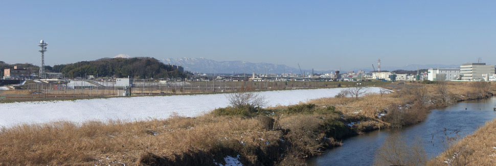 亀の甲橋から上流方面をのぞむと薄っら白く冠雪した丹沢と富士山、さらに南アルプスらしき山並みも見えるほどの快晴だ。