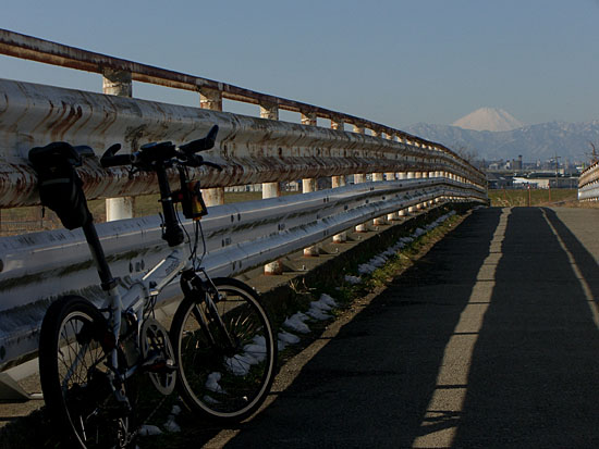 丹沢と富士山をのぞみながらのんびりと上流に向かう。左岸側はほとんど土手上の雪は解けていて走行に問題なかった。橋の下に一部残こっていた程度だ。ほどなく市ヶ尾高校裏に到着。まだ時間はありそうなので寺家ふるさと村までいってみることにする。少し戻って橋を渡り右岸を走行。こちらは日影になっている部分が数百メートルに渡り雪が残り凍ってしまっていた。自転車を押して足下に気をつけながら通過。