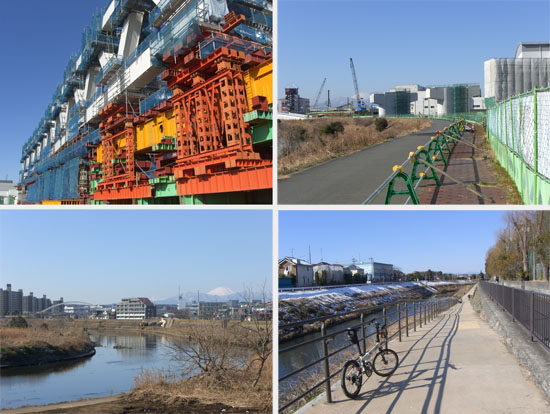 復路はちょっととばした区間があったせいか後半太腿が攣り気味に…。新羽橋で右岸に渡り折り返す。日差しがぽかぽかで気持ち良い。横浜アリーナ裏手あたりの土手は3月下旬まで改良工事のため通行止めとなっていたので脇の階段を自転車を担いで降りる。
