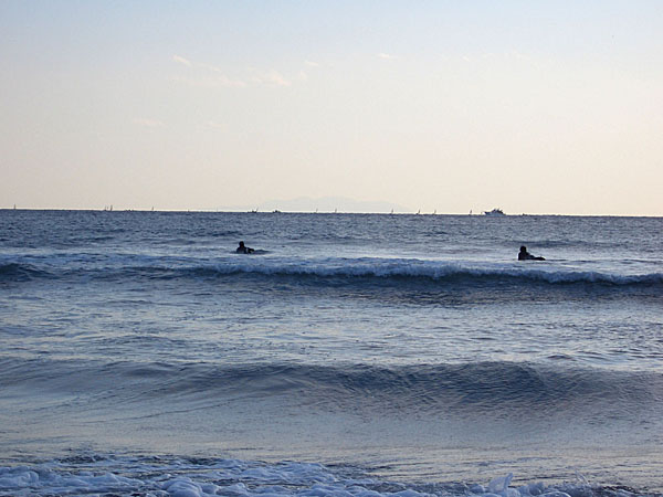 鎌倉高校前駅の踏切を渡り坂道を上って振り返ると踏切越しに相模湾が輝いていた。駅前に戻り何台か江ノ電が通過するのを眺めた後に七里ヶ浜に降りてみる。波打ち際でしばらくぼんやりと波の満ち引きを眺める。遠くに伊豆大島が霞んでみえていた。